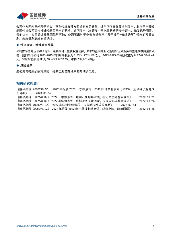 国信农业观点:1)报告期内,公司以低效资产、美元贷款等为代表的历史包袱进一步出清,且美元贷款问题有望在2023年下半年完全解决,而员工激励和研发支出则有望其为长足发展提供支撑。轻装上阵后,我们看好公司水稻业务稳健发展和玉米业务快速扩张。2)从行业角度来看,短期由厄尔尼诺带来的极端高温或催化粮价表现进而支撑板块业绩,长期转基因种子商业化落地有望打开行业成长空间,而隆平高科作为国内玉米种子龙头,已在传统育种方面拥有充足储备,近年正依靠参股杭州瑞丰、北京国丰等转基因性状公司稳步推进转基因玉米的研发,旗下瑞丰125等多个玉米性状获得安全证书,先发优势明显。如若转基因能够落地,公司玉米种子业务有望分享“种子提价+份额提升”带来的双重红利,未来量利高增有望延续。3)风险提示:恶劣天气带来的制种风险,转基因政策落地不及预期的风险。4)投资建议:公司作为国内玉米种子龙头,兼具品种、性状双重优势,未来转基因商业化落地后玉米业务有望继续维持量价双击。我们预计公司2023-2025年归母净利润为3.53/4.97/6.49亿元,2023-2025年每股收益为0.27/0.38/0.49元,对应当前股价PE为60.6/43.0/32.9X,维持“买入”评级。