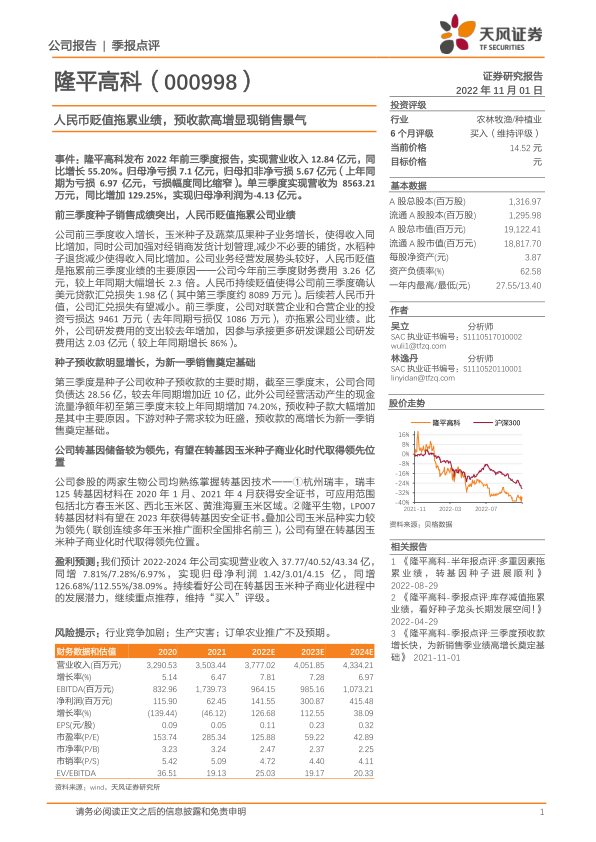 隆平高科2022年前三季度报告显示,公司营收实现强劲增长,尤其在玉米种子及蔬菜瓜果种子业务方面表现突出,并通过优化经销商管理提升了销售效率。尽管受人民币贬值导致的汇兑损失、联营企业投资亏损及研发费用增加等因素影响,公司归母净利润仍处于亏损状态,但亏损幅度同比有所收窄。值得关注的是,公司合同负债大幅增加近10亿元,经营活动现金流净额同比大增74.20%,预收款的高增长充分体现了下游市场对种子需求的旺盛,为未来销售业绩奠定了坚实基础。此外,公司在转基因技术领域拥有领先的储备,参股公司在转基因材料安全证书方面取得重要进展,结合其在玉米品种方面的优势,有望在转基因玉米种子商业化时代占据领先地位,驱动长期增长。基于对公司未来业绩的积极展望和在转基因领域的战略优势,分析师维持“买入”评级。