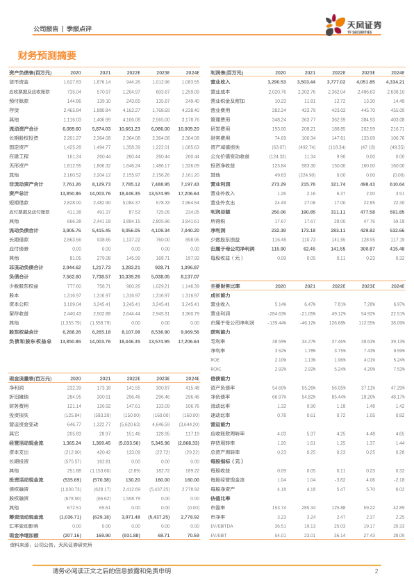 天风证券预计隆平高科2022-2024年将实现营业收入分别为37.77亿元、40.52亿元和43.34亿元,同比分别增长7.81%、7.28%和6.97%。归属于母公司净利润预计分别为1.42亿元、3.01亿元和4.15亿元,同比分别增长126.68%、112.55%和38.09%。