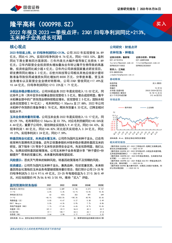 投资建议:公司作为国内玉米种子龙头,兼具品种、性状双重优势,未来转基因商业化落地后玉米业务有望继续维持量价双击。我们预计公司23-25年归母净利润为3.53/4.97/6.49亿元,23-25年每股收益为0.27/0.38/0.49元,对应当前股价PE为56.8/40.3/30.9X,维持“买入”评级。