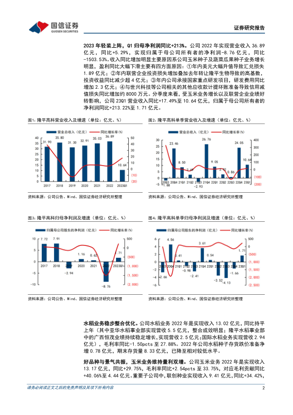 2022年报及2023一季报点评:23Q1归母净利润同比+213%,玉米种子业务成长可期