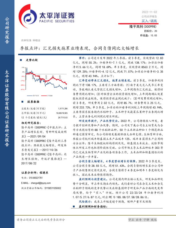 隆平高科2022年前三季度业绩受汇兑损失等非经常性因素影响,归母净利润出现下滑,但扣非后归母净利润实现增长,显示主营业务稳健发展。公司在研发方面持续投入并取得显著成效,新品种审定数量和生物育种技术均有突破。同时,合同负债的大幅增长预示着未来营收增长潜力巨大。综合来看,公司作为种业龙头,具备核心竞争优势和先发布局优势,未来业绩增长可期,太平洋证券维持“买入”评级。