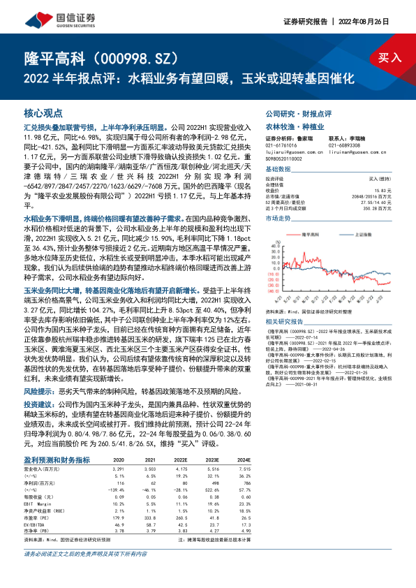 风险提示:恶劣天气带来的制种风险,转基因政策落地不及预期的风险。投资建议:公司作为国内玉米种子龙头,是国内兼具品种、性状双重优势的稀缺玉米标的,业绩有望在转基因商业化落地后迎来种子提价、份额提升的业绩双击,未来成长空间或被打开。我们维持此前预测,预计公司22-24年归母净利润为0.80/4.98/7.86亿元,22-24年每股受益为0.06/0.38/0.60元,对应当前股价PE为260.5/41.8/26.5X,维持“买入”评级。