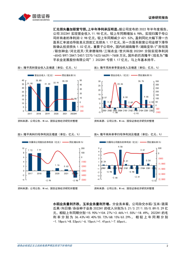 汇兑损失叠加联营亏损,上半年净利承压明显。公司2022H1实现营业收入11.98亿元,同比+6.98%,实现归属于母公司所有者的净利润-2.98亿元,同比-421.52%,盈利同比下滑明显一方面系汇率波动导致美元贷款汇兑损失1.17亿元,另一方面系联营公司业绩下滑导致确认投资损失1.02亿元。重要子公司中,国内的湖南隆平/湖南亚华/广西恒茂/联创种业/河北巡天/天津德瑞特/三瑞农业/世兴科技2022H1分别实现净利润-6542/897/2847/2457/2270/1623/6629/-7608万元,国外的巴西隆平(现名为“隆平农业发展股份有限公司”)2022H1亏损1.17亿元,与上年基本持平。