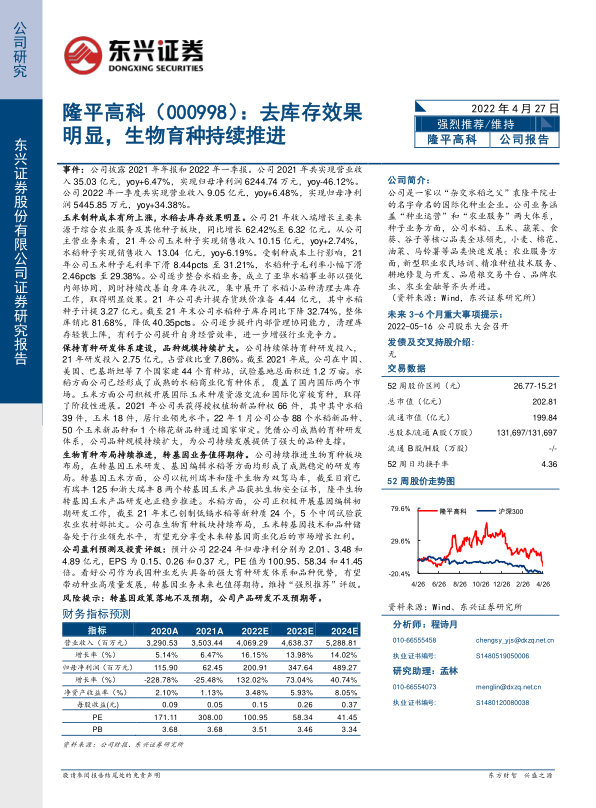 公司盈利预测及投资评级: 预计公司 22-24 年归母净利分别为 2.01、 3.48 和4.89 亿元, EPS 为 0.15、 0.26 和 0.37 元, PE 值为 100.95、 58.34 和 41.45倍。 看好公司作为我国种业龙头具备的强大育种研发体系和品种优势, 有望带动种业高质量发展,转基因业务未来也值得期待。 维持“强烈推荐” 评级。