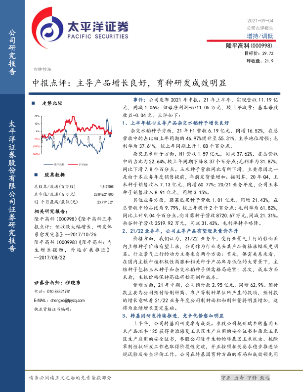 本报告对隆平高科2021年中报进行了详细分析,指出公司核心主导产品杂交水稻种子业务增长良好,育种研发成效显著,转基因研发持续推进,竞争优势明显。同时,报告预测公司未来业绩有望量价齐升,并维持“买入”评级。但报告也提示了种子价格上涨不及预期以及天气因素导致制种产量下降和制种成本上升的风险。