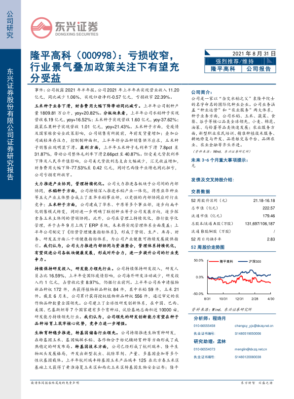 行业景气上行叠加种业政策关注下公司有望充分受益。 我们认为, 随着国内玉米去库存取得明显成效,加之生猪产能恢复带动饲用玉米需求上涨,玉米价格处于明显景气区间,带动其他粮食价格出现不同程度上涨,种植收益提升推动种子需求上涨,行业处于景气上行区间。同时,自去年以来,种业发展也持续受到政策关注, 8 月 17 日,《 种子法( 修正草案)》提请全国人大常委会审议,草案扩大了植物新品种权的保护范围及保护环节, 并正式提出全面建立实质性派生品种制度( EDV), 进一步强化了种业知识产权保护力度。 我们认为, 当前种业已进入行业景气向上与政策红利释放共振期,公司作为国内种业龙头,有望充分受益于行业提质扩容机遇,成为我国种业创新发展的执牛耳者。