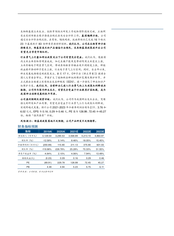 公司盈利预测及投资评级: 我们认为, 公司作为我国种业龙头企业,凭借强大的研发和产品优势,有望充分受益于行业景气上行与政策红利释放,实现跨越式发展。 预计公司 2021-2023 年归母净利润分别为 2.11、 3.76 和6.02 亿元, EPS 为 0.16、 0.29 和 0.46 元, PE 值为 128.99、 72.45 和 45.27倍。 维持“强烈推荐” 评级。