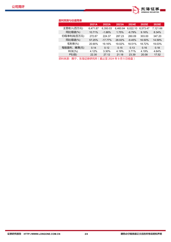 公司上半年业绩低于预期,下调2024-2026年归母净利润预测至2.60、3.03、3.47亿元,对应EPS分别为0.13、0.16、0.18元,对应PE分别为23.39、20.08、17.52倍。维持“买入”评级。