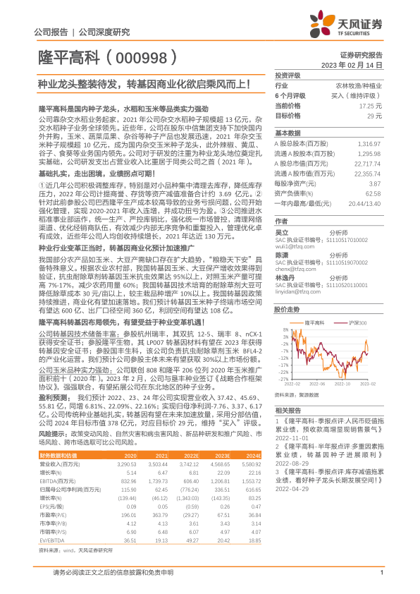 盈利预测:我们预计2022、23、24年公司实现营业收入37.42、45.69、55.81亿,同增6.81%、22.09%、22.16%;实现归母净利润-7.76、3.37、6.17亿。公司传统种业基础扎实,转基因有望在未来加速放量,采用分部估值,公司2024年目标市值378亿元,对应目标价29元,维持“买入”评级。