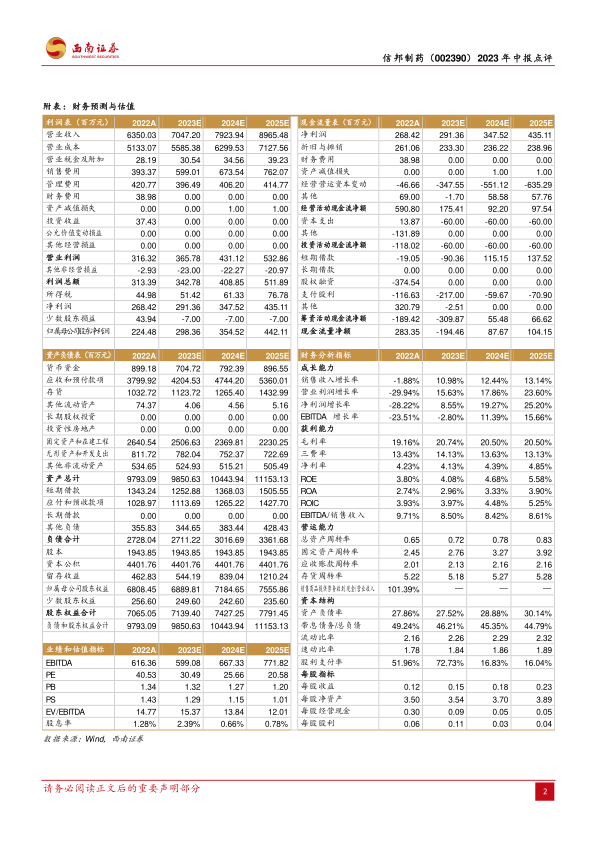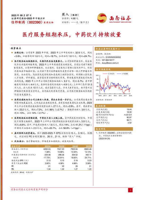 本报告对信邦制药2023年中报进行了全面分析。公司上半年营收和利润均实现增长,其中医药流通业务保持稳健,中药饮片业务表现亮眼。医疗服务板块虽然短期承压,但长期来看仍具潜力。维持对公司“买入”评级,但需关注潜在风险。