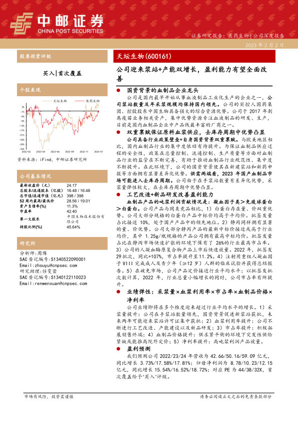 天坛生物作为国内血制品行业的龙头企业,在国资背景和政策优势的双重加持下,拥有领先的浆站数量和采浆规模,并持续通过业务整合、工艺改造和新品研发优化产品结构。面对行业去库存周期和疫情后需求回暖,公司凭借其采浆量弹性、血浆利用率提升、市场份额扩大以及高吨浆利润产品放量等多重驱动因素,预计将实现营收和归母净利润的稳健增长。报告首次覆盖给予“买入”评级,但投资者仍需关注市场推广、临床试验进展和新浆站建设进度等潜在风险。