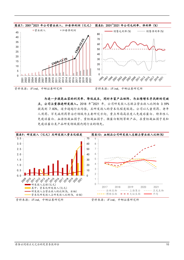 2017年,天坛生物完成重大资产重组,剥离疫苗业务相关资产,集中优势资源专注于血液制品的研发和生产,成为中国生物旗下唯一的血液制品业务平台。此次整合后,公司营业收入从2017年的17.65亿元增长至2021年的41.12亿元,年复合增长率达23.5%;归母净利润从4亿元增长至7.6亿元,年复合增长率达17.4%。公司目前拥有人血白蛋白、人免疫球蛋白、人凝血因子等三大类、14个品种、72个血液制品生产文号,是国内产品线最丰富的血制品企业之一。公司持续加大研发投入,2021年研发投入占营业收入比例达7.83%,高于行业均值,重点布局高浓度免疫球蛋白、特异性免疫球蛋白、血源性凝血因子、重组凝血因子等新产品。