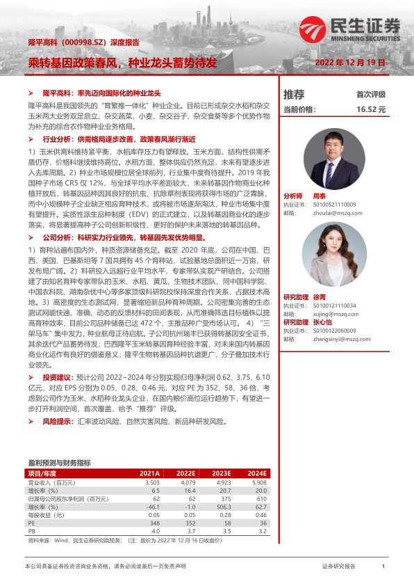 投资建议:预计公司2022~2024年分别实现归母净利润0.62、3.75、6.10亿元,对应EPS分别为0.05、0.28、0.46元,对应PE为352、58、36倍,考虑到公司作为玉米、水稻种业龙头企业,在国内粮价高位运行趋势下,有望进一步打开利润空间,首次覆盖,给予“推荐”评级。