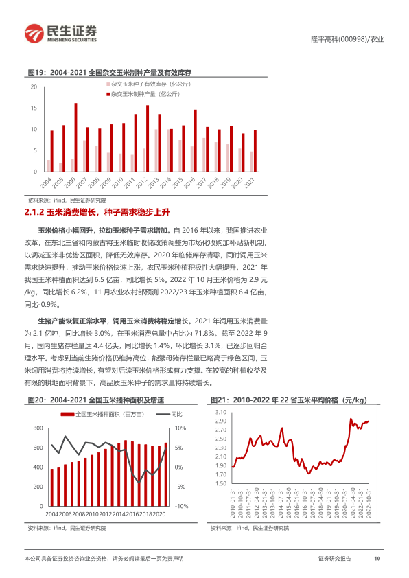 我国杂交玉米种子行业集中度较低,2020年CR3仅为14%,隆平高科以6%市占率位居第一。自2016年供给侧改革以来,杂交玉米制种面积持续下降,从410万亩降至2021年的272万亩,降幅达33.7%。制种产量也从14.7亿公斤下滑至9.9亿公斤,有效库存接近历史低点(2021年为4.8亿公斤)。需求端,玉米价格自2020年临储库存清零后快速上涨,2022年10月玉米价格为2.9元/kg,同比增长6.2%,农民种植积极性提升。生猪产能恢复带动饲用玉米消费稳定增长,2021年饲用玉米消费量达2.1亿吨,占总消费量的71.8%。高种植收益和有限耕地面积将持续拉动高品质玉米种子需求。