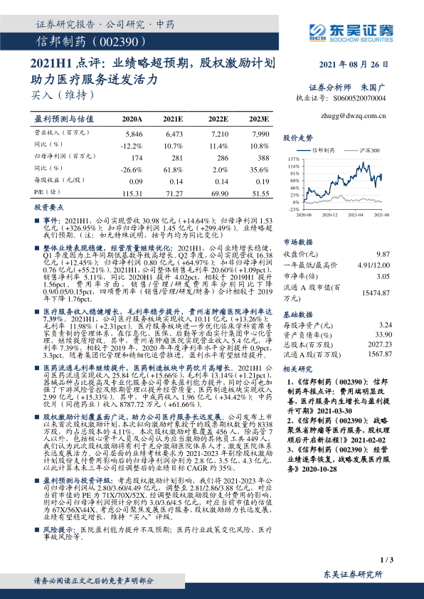 信邦制药2021年上半年业绩稳健增长,经营质量持续优化,医疗服务和医药业务双轮驱动,股权激励计划有望激发公司长远发展活力。公司医疗服务板块表现突出,贵州省肿瘤医院盈利能力提升显著。医药流通和制造板块也保持增长势头,中药饮片业务表现亮眼。公司推出股权激励计划,覆盖面广,有利于激励核心骨干人员,并设定了未来三年经调整后的业绩目标。维持“买入”评级。