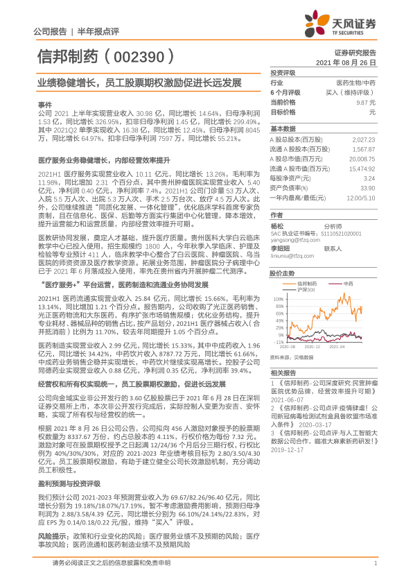 信邦制药2021年上半年业绩表现亮眼,医疗服务业务稳健增长,内部经营效率持续提升。公司通过股权激励和所有权与经营权的统一,激发了员工的积极性,为长远发展奠定了基础。同时,公司积极拓展医药制造和流通业务,构建“医疗服务+”平台,实现协同发展。维持“买入”评级,但需关注政策和行业变化、医疗服务业绩、医疗事故以及医药流通和制造业绩等风险因素。