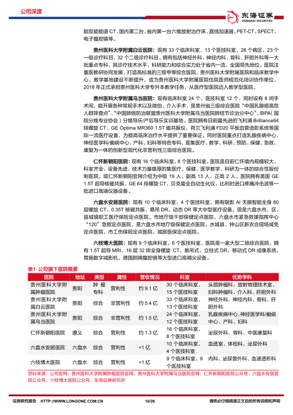 医疗服务板块:肿瘤专科与综合医院齐头并进,毛利率已呈抬头趋势。 公司医疗服务板块呈快速增长态势, 2014-2022年CAGR为19.6%。 2023年上半年收入为9.2亿元(yoy-5.7%),短期增速放缓; 毛利率为13.6%(+0.2pct),已恢复至2019年水平。 公司医疗服务板块在贵州省内拥有肿瘤专科及综合医院合计6家医疗机构, 合计拥有床位数近5千张。 1.肿瘤专科:省内肿瘤治疗需求旺盛,唯一三甲肿瘤专科优势显著。 贵州医科大学附属肿瘤医院是省内唯一的三甲肿瘤专科医院,目前开放床位1500余张, 2022年营收9.17亿元。 肿瘤医院汇集高层次专家人才,医疗设备领先,拥有GCP机构和多样化的科研平台。 2.综合医院:省医科大持续赋能,综合服务能力领先。 白云医院、乌当医院是贵州省内高知名度的综合医院,均拥有各自的特色学科。其中, 白云医院受益于医教研一体, 预期5年增加3千床位, 10年成为当地一流医院。
