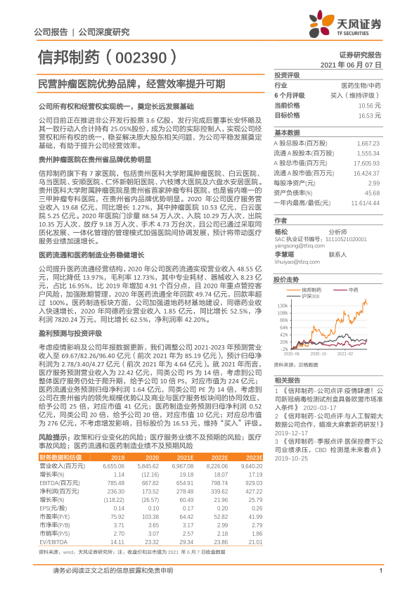 信邦制药旗下有7家医院,包括贵州医科大学附属肿瘤医院、白云医院、乌当医院、安顺医院、仁怀新朝阳医院、六枝博大医院及六盘水安居医院。贵州医科大学附属肿瘤医院是贵州省首家肿瘤专科医院,也是省内唯一的三甲肿瘤专科医院,在贵州省内品牌优势明显。2020年公司医疗服务营业收入19.68亿元,同比增长1.27%,其中肿瘤医院10.53亿元,白云医院5.25亿元。2020年医院门诊量88.54万人次、入院10.29万人次、出院10.35万人次、放疗9.18万人次、手术4.73万台次,且公司已通过采取同质化发展、一体化管理的管理模式加强医院间协调发展,预计将带动医疗服务业绩加速增长。