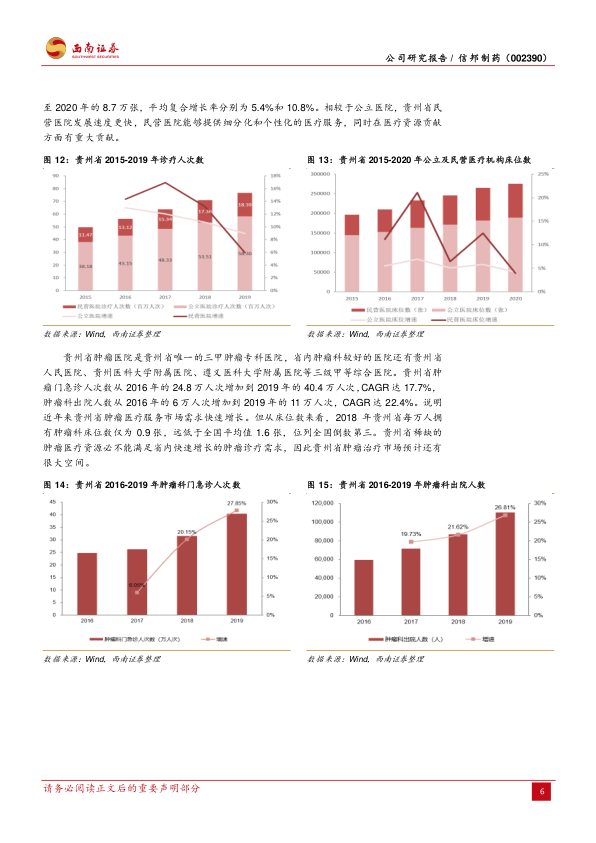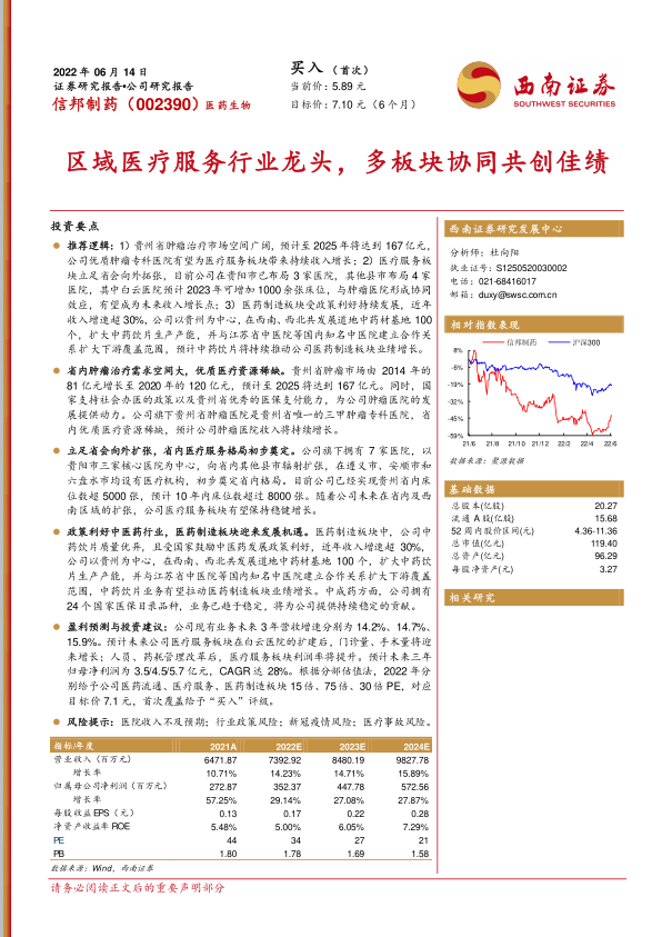 推荐逻辑:1 )贵州省肿瘤治疗市场空间广阔,预计至 2025 年将达到 167 亿元,公司优质肿瘤专科医院有望为医疗服务板块带来持续收入增长;2 )医疗服务板块立足省会向外拓张,目前公司在贵阳市已布局 3 家医院,其他县市布局 4 家医院,其中白云医院预计 2023 年可增加 1000 余张床位,与肿瘤医院形成协同效应,有望成为未来收入增长点;3 )医药制造板块受政策利好持续发展,近年收入增速超 30 %, 公司以贵州为中心,在西南、西北共发展道地中药材基地 100个,扩大中药饮片生产产能,并与江苏省中医院等国内知名中医院建立合作关系扩大下游覆盖范围,预计中药饮片将持续推动公司医药制造板块业绩增长。