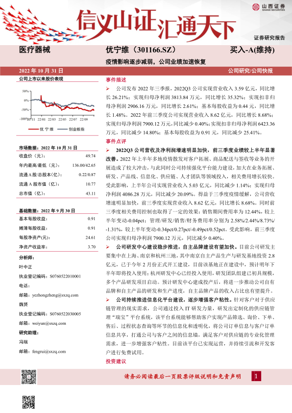 尽管对部分财务预测数据进行了下调,但考虑到公司业绩的加速恢复和长期增长潜力,分析师维持了对优宁维的“买入-A”评级。以2022年10月31日收盘价49.74元计算,公司2022年至2024年的对应市盈率(P/E)分别为37.1倍、27.8倍和20.7倍,显示出随着业绩增长,估值水平将逐步趋于合理。