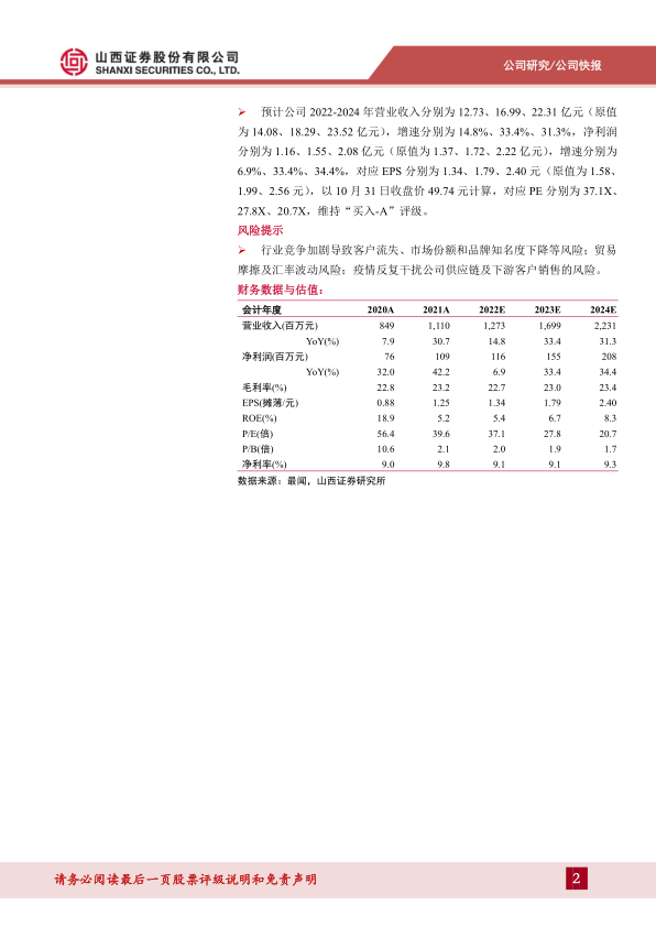 预计公司2022-2024年营业收入分别为12.73、16.99、22.31亿元(原值为14.08、18.29、23.52亿元),增速分别为14.8%、33.4%、31.3%,净利润分别为1.16、1.55、2.08亿元(原值为1.37、1.72、2.22亿元),增速分别为6.9%、33.4%、34.4%,对应EPS分别为1.34、1.79、2.40元(原值为1.58、1.99、2.56元),以10月31日收盘价49.74元计算,对应PE分别为37.1X、27.8X、20.7X,维持“买入-A”评级。