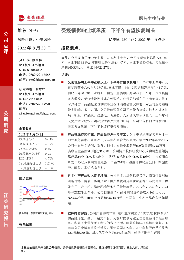 维持推荐评级。 公司产品种类丰富,在行业内树立了“优宁维-抗体专家”的品牌形象,基于一站式平台,为客户提供专业全面的生命科学综合服务,积累了大量优质且稳定的客户资源, 随着疫情防控形势的好转,下半年公司业绩有望恢复增长。 预计公司2022年、 2023年每股收益分别为1.63元和2.05元,对应估值分别为32倍和25倍, 维持“推荐”评级