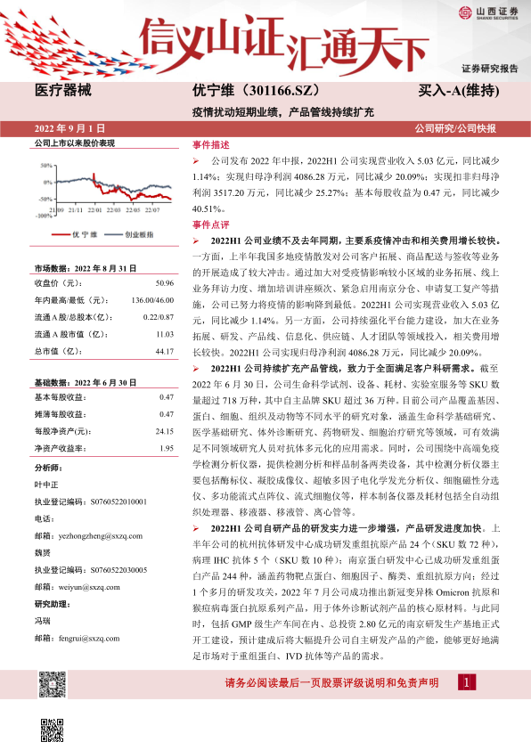 优宁维(301166.SZ)在2022年上半年受疫情冲击和战略性投入增加的影响,短期业绩有所承压,营业收入和净利润均出现同比下滑。然而,公司积极应对外部挑战,通过加大业务拓展、强化平台建设、持续扩充产品管线以及增强自主研发实力,展现出强劲的内生增长动力。截至报告期末,公司已拥有超过718万种SKU,并成功研发多款关键生物试剂产品,同时启动了南京研发生产基地建设,为未来产能提升和市场需求满足奠定基础。分析师维持“买入-A”评级,预计公司未来几年营收和净利润将实现稳健增长,但投资者仍需关注行业竞争、贸易摩擦及疫情反复等潜在风险。总体而言,优宁维在短期挑战中积极布局,长期增长潜力值得期待。