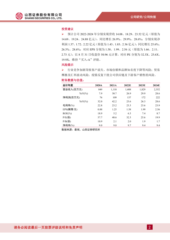 预计公司2022-2024年分别实现营收14.08、18.29、23.52亿元(原值为14.69、19.24、24.88亿元),同比增长26.9%、29.9%、28.6%;分别实现净利润1.37、1.72、2.22亿元(原值为1.43、1.83、2.36亿元),同比增长25.6%、26.3%、28.6%;对应EPS分别为1.58、1.99、2.56元(原值为1.66、2.11、2.73元),以8月31日收盘价50.96元计算,对应PE分别为32.3X、25.6X、19.9X,维持“买入-A”评级。