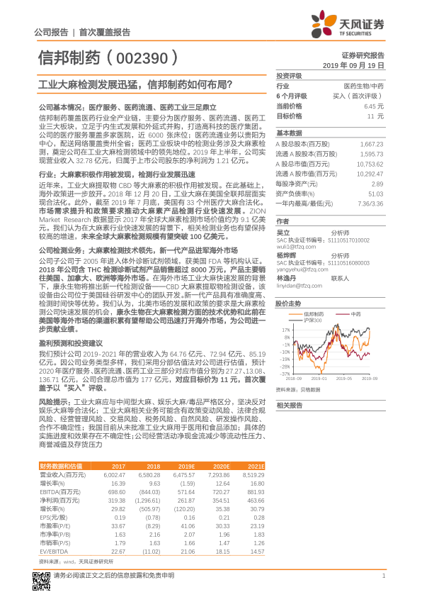 报告基于分部估值法,充分考虑了各业务板块的特点和增长潜力,特别是对工业大麻检测业务给予了高成长性溢价。最终给予公司“买入”评级,目标价11元,体现了对信邦制药在工业大麻检测这一新兴高增长市场中领先地位和未来发展前景的积极认可。