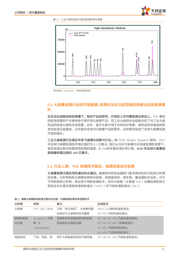 - 市场规模: 市场需求提升和政策要求推动大麻素产品检测行业快速发展。ZION Market Research数据显示,2017年全球大麻素检测市场价值约为9.1亿美元。报告预计,在大麻素行业快速发展的背景下,相关检测业务有望保持较高增速,未来全球大麻素检测规模有望突破100亿美元(按20%的年复合增长率计算,至2030年)。