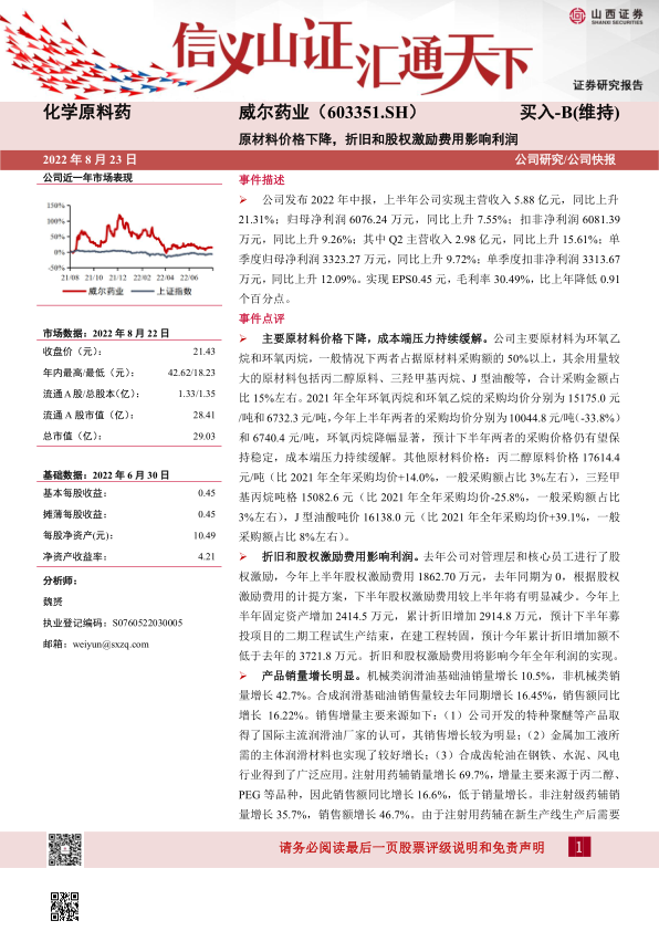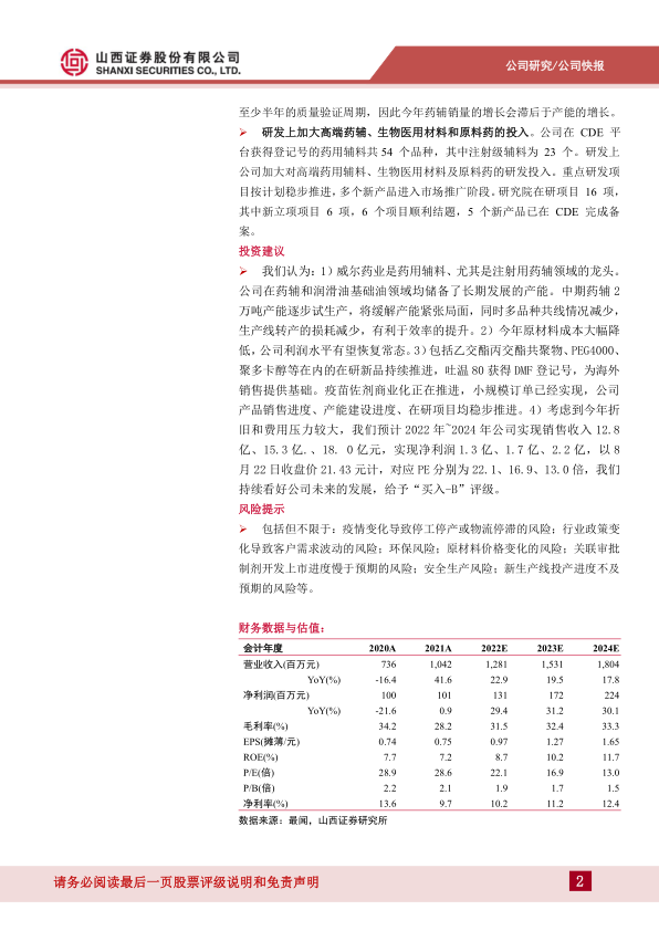 我们认为:1)威尔药业是药用辅料、尤其是注射用药辅领域的龙头。公司在药辅和润滑油基础油领域均储备了长期发展的产能。中期药辅2万吨产能逐步试生产,将缓解产能紧张局面,同时多品种共线情况减少,生产线转产的损耗减少,有利于效率的提升。2)今年原材料成本大幅降低,公司利润水平有望恢复常态。3)包括乙交酯丙交酯共聚物、PEG4000、聚多卡醇等在内的在研新品持续推进,吐温80获得DMF登记号,为海外销售提供基础。疫苗佐剂商业化正在推进,小规模订单已经实现,公司产品销售进度、产能建设进度、在研项目均稳步推进。4)考虑到今年折旧和费用压力较大,我们预计2022年~2024年公司实现销售收入12.8亿、15.3亿.、18.0亿元,实现净利润1.3亿、1.7亿、2.2亿,以8月22日收盘价21.43元计,对应PE分别为22.1、16.9、13.0倍,我们持续看好公司未来的发展,给予“买入-B”评级。