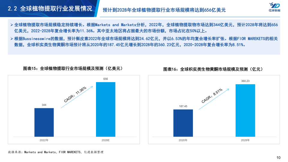 全球植物提取市场规模持续增长。根据Markets and Markets的分析,2022年全球植物提取物市场规模达到344亿美元,预计到2028年将达到656亿美元,2022-2028年复合增长率为11.36%。其中,亚太地区将占据最大的市场份额,市场占比超过50%。