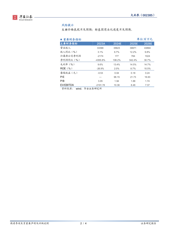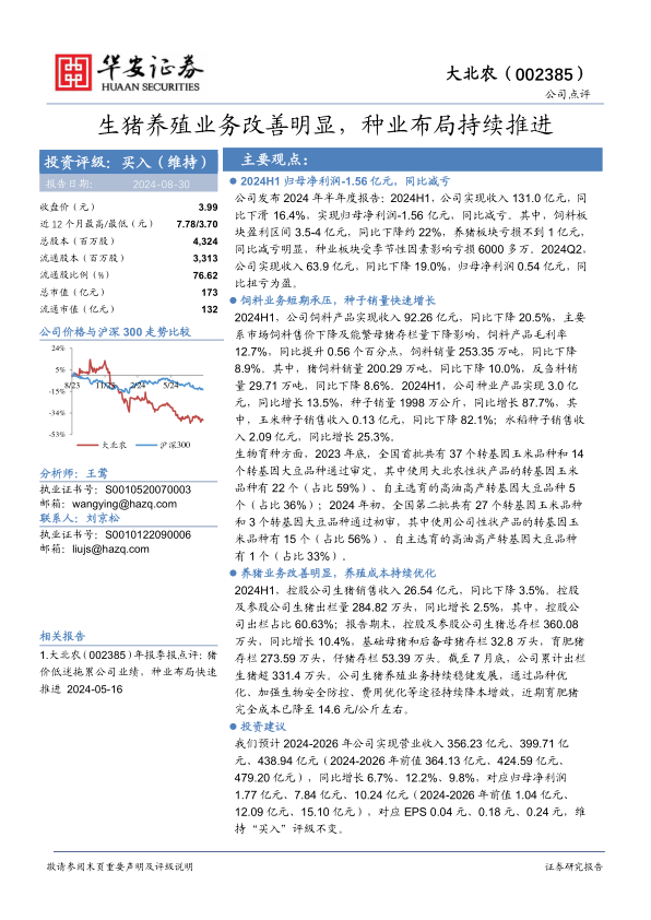本报告通过对大北农公司2024年半年度报告的分析,指出公司在业绩改善、业务结构调整和生物育种方面取得的进展。虽然饲料业务短期承压,但种子业务增长迅速,养猪业务亏损收窄,成本控制有效。维持“买入”评级,并给出了未来几年的盈利预测和投资建议,但同时也提示了生猪价格波动和转基因商业化进度不及预期的风险。