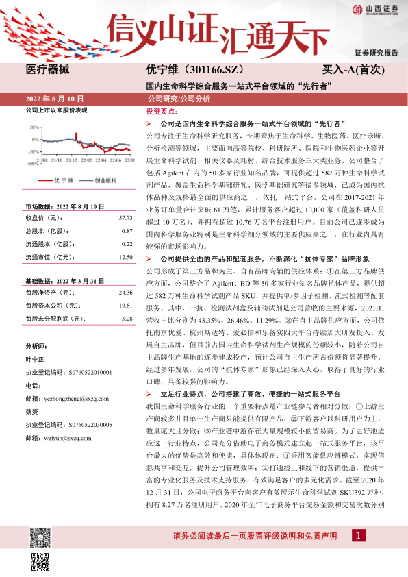 在国家政策大力支持生命科学和生物医药产业发展、基础科研投入持续加大的背景下,生命科学服务行业展现出高景气度和巨大的市场潜力。优宁维凭借其优质广泛的客户及供应商资源、持续提升的自主研发能力以及规模效应的逐步显现,实现了营收和净利润的持续稳健增长。报告预测公司未来三年(2022-2024年)将保持30%左右的营收和净利润增速,且当前估值低于同业可比公司平均水平,具备较高的投资价值,首次覆盖给予“买入-A”评级。
