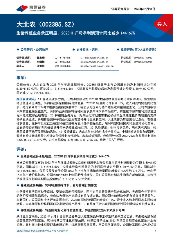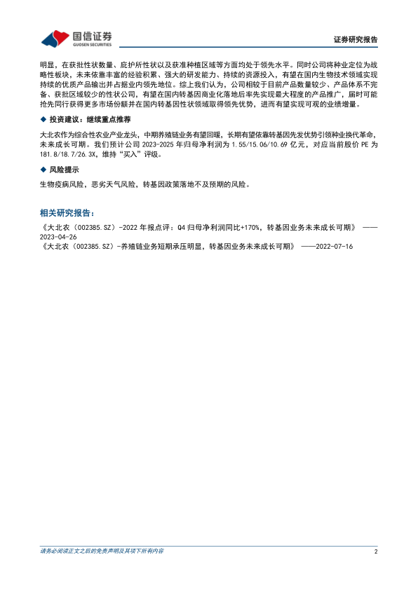 国信农业观点: 1) 养殖链业务方面, 公司参控股公司 2023H1 生猪出栏量逆势同比增长约 40%, 但业绩因猪价低迷承压明显, 而饲料业务依旧维持良好发展, 2023H1 销量同比增长约 18%, 收入利润均实现同比增长。 考虑到今年下半年的猪价预期依然偏保守, 我们认为国内母猪产能后续有望加速去化, 公司养殖板块中期有望直接受益景气, 而饲料业务随原料价格回落以及高端饲料产品推广, 有望在下游养殖利润修复过程中延续较好业绩表现。 2) 种植链业务方面, 短期由厄尔尼诺带来的极端高温或催化粮价表现进而支撑种子板块业绩, 长期转基因种子商业化落地有望打开行业成长空间。 大北农作为转基因性状龙头, 在获批性状数量、 庇护所性状以及获准种植区域等方面均处于领先地位, 届时有望引领国内种业品种换代革命,或充分受益市场扩容和份额提升带来的双重成长红利。 3) 风险提示: 生物疫病风险, 恶劣天气风险, 转基因政策落地不及预期的风险。 4) 投资建议: 大北农作为综合性农业产业龙头, 中期养殖链业务有望回暖,长期有望依靠转基因先发优势引领种业换代革命, 未来成长可期。 我们预计公司 2023-2025 年归母净利润为1.55/15.06/10.69 亿元, 对应当前股价 PE 为 181.8/18.7/26.3X, 维持“买入” 评级。
