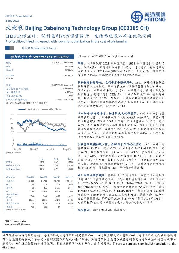 本报告对大北农(002385 CH)2023年上半年的业绩进行了分析,并提出了投资建议。