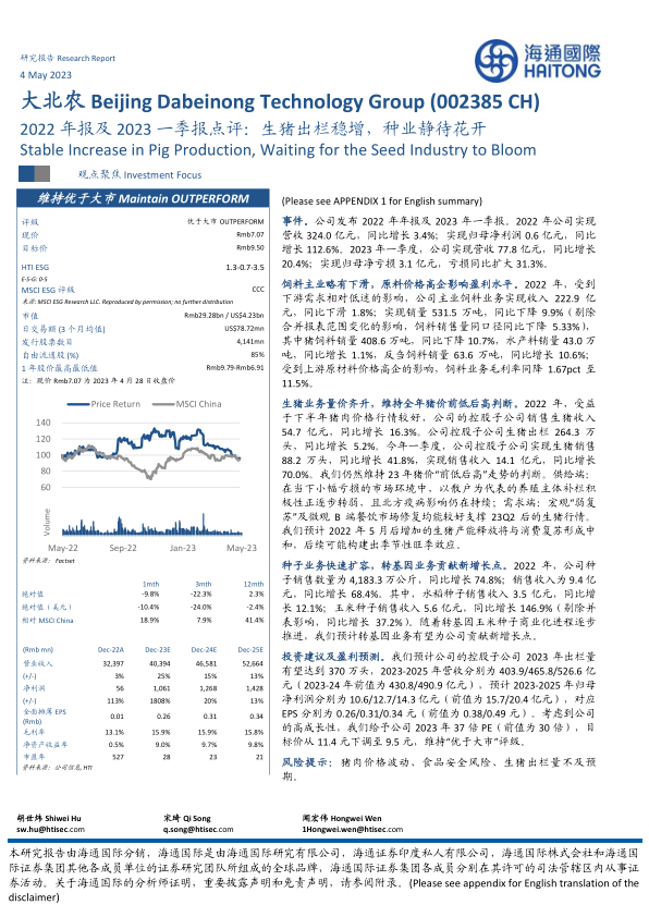 本报告深入分析了大北农(002385 CH)2022年年报及2023年一季报,核心观点指出公司在生猪养殖业务上实现了稳健增长,并预计未来将持续受益于猪价的“前低后高”走势及产能释放与消费复苏的平衡。同时,种子业务,特别是转基因玉米种子的商业化进程,被视为公司未来新的重要增长点,有望带来业绩的快速扩容。尽管饲料主业面临原料价格高企和下游需求低迷的挑战,导致盈利水平短期承压,但公司整体战略布局清晰,通过优化业务结构和抓住市场机遇,展现出较强的成长韧性。