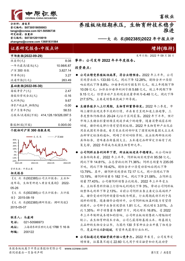 2022年中报点评:养殖板块短期承压,生物育种技术稳步推进
