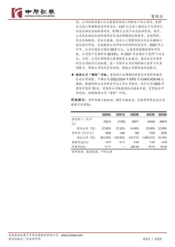 维持公司“增持”评级。考虑到行业周期性的变化及原料价格高位运行等因素,下调公司2022-2024年EPS为0.04/0.42/0.49元每股。根据饲料行业及种业可比上市公司情况,给予公司2023年整体市盈率18倍,考虑到公司转基因性状储备丰富,有望抢占市场先机,继续维持公司“增持”评级。