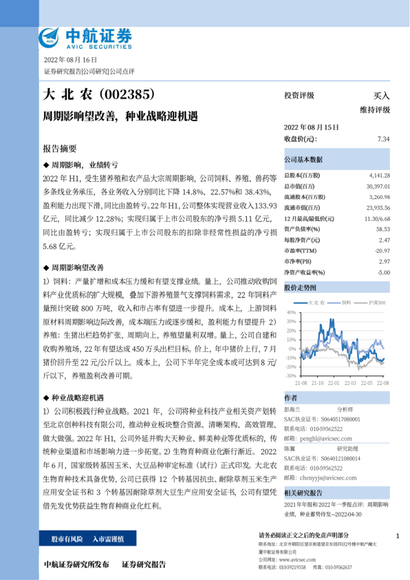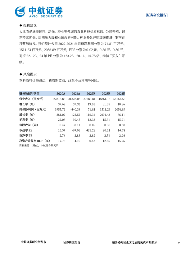 大北农是涵盖饲料、动保、种业等领域的农业科技优质标的。公司养殖、饲料持续扩张,周期压力缓和业绩改善可期。种业外延并购加速推进,生物育种蓄势待发。我们预计公司2022-2024年归母净利润分别为71.81百万元、1511.23百万元、2056.89百万元,EPS分别为0.02元、0.36元、0.50元,对应22、23、24年PE分别为423.28、20.11、14.78倍,维持“买入”评级。