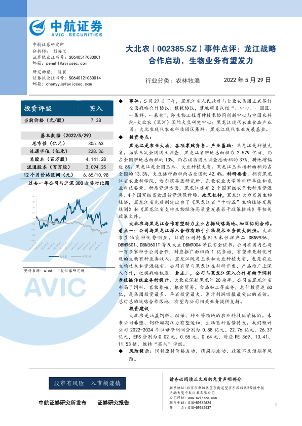 大北农与黑龙江合作有望助力主业占据战略高地、加深协同合作。看点一:公司与黑龙江深入合作有助于生物技术业务做大做强。大北农生物育种优势明显。目前公司转基因玉米性状产品DBN9936、DBN9501、DBN3601T等及大豆DBN9004等获安全证书。公司在国内已与一百多家种子公司合作,对应推广面积约1亿多亩,有望率先转化可观的生物育种业务收入。黑龙江既是玉米和大豆种植大省,也是农业生物技术和资源强省。公司有望与黑龙江在科研开发、产品推广上深入合作,把握战略机遇。看点二,公司与黑龙江深入合作有助于饲料养殖链传统业务的提升。大北农深耕黑龙江20余年,公司在黑龙江省布局了饲料、畜牧养殖、粮食贸易、食品加工等业务,总计投资达60亿,是集团投资最多、单省投资最大、累计利润回报最突出的省份。总对总的战略合作落地,有望为公司相关业务提供支持。