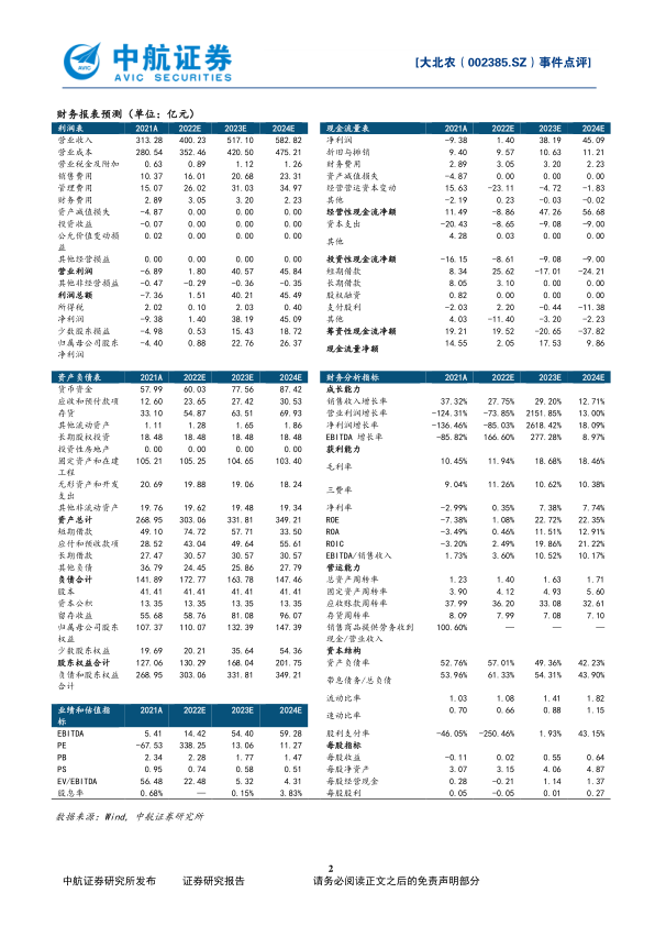 大北农是涵盖饲料、动保、种业等领域的农业科技优质标的。未来公司养殖、饲料周期压力有望缓和、生物育种蓄势待发。我们预计公司2022-2024年归母净利润分别为0.88亿元、22.76亿元、26.37亿元,EPS分别为0.02元、0.55元、0.64元,对应PE369、13.41、11.53倍,维持“买入”评级。