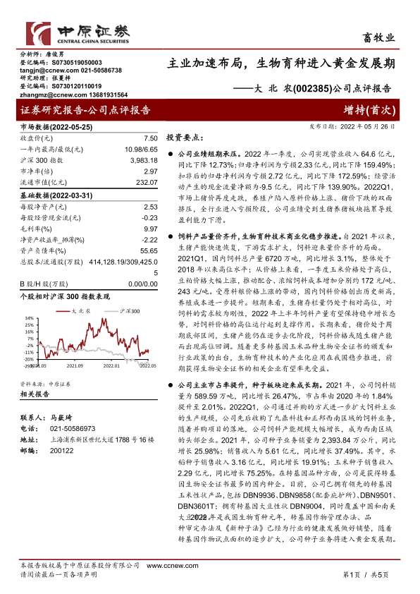 本报告分析了大北农(002385)公司2022年一季度的业绩表现,指出公司短期业绩受到猪价下跌和成本上升的影响而承压。但与此同时,公司在饲料业务和生物育种领域均展现出强劲的增长潜力。饲料业务方面,公司通过扩大规模和提升市占率,巩固了行业地位;生物育种方面,公司凭借领先的转基因技术和政策支持,有望迎来快速发展。 报告首次覆盖给予公司“增持”评级,并对公司未来三年的营业收入和净利润进行了预测,认为公司具备长期投资价值。