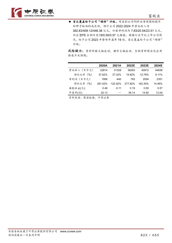 首次覆盖给予公司“增持”评级。考虑到公司饲料业务规模的提升和种子板块的成长性,预计公司2022-2024年营业收入为362.83/409.12/446.38亿元,归母净利润为7.83/20.54/23.51亿元,对应EPS分别为0.19/0.50/0.57元每股。根据行业可比上市公司情况,给予公司2023年整体市盈率19倍,首次覆盖给予公司“增持”评级。风险提示:原料价格大幅波动,猪价大幅波动,生物育种商业化应用推进不及预期。