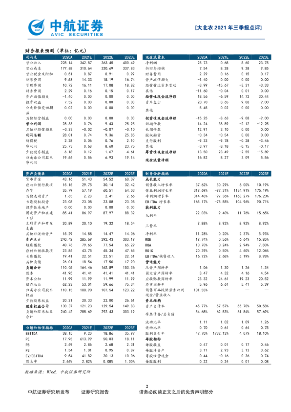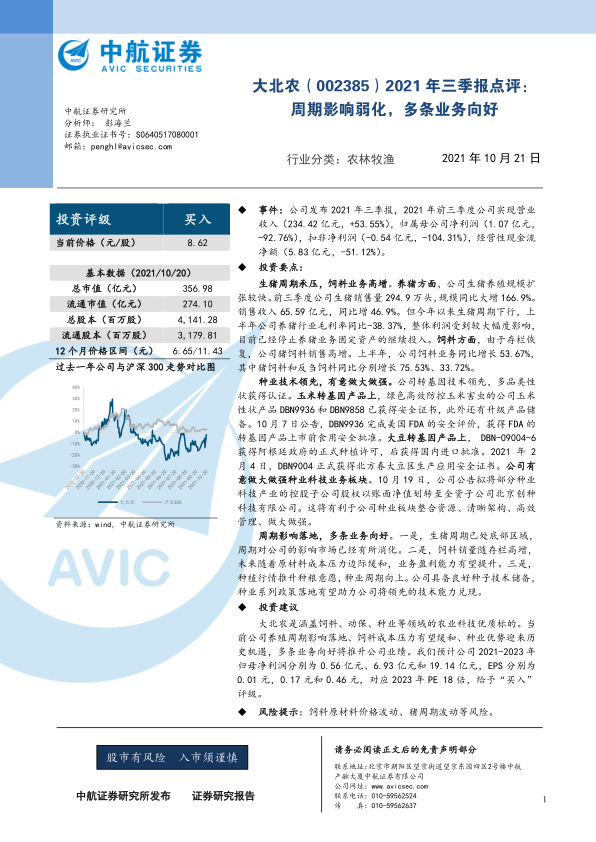 大北农是涵盖饲料、动保、种业等领域的农业科技优质标的。 当前公司养殖周期影响落地、饲料成本压力有望缓和、种业优势迎来历史机遇,多条业务向好将推升公司业绩。 我们预计公司 2021-2023 年归母净利润分别为 0.56 亿元、 6.93 亿元和 19.14 亿元, EPS 分别为0.01 元, 0.17 元和 0.46 元,对应 2023 年 PE 18 倍,给予“买入”评级。