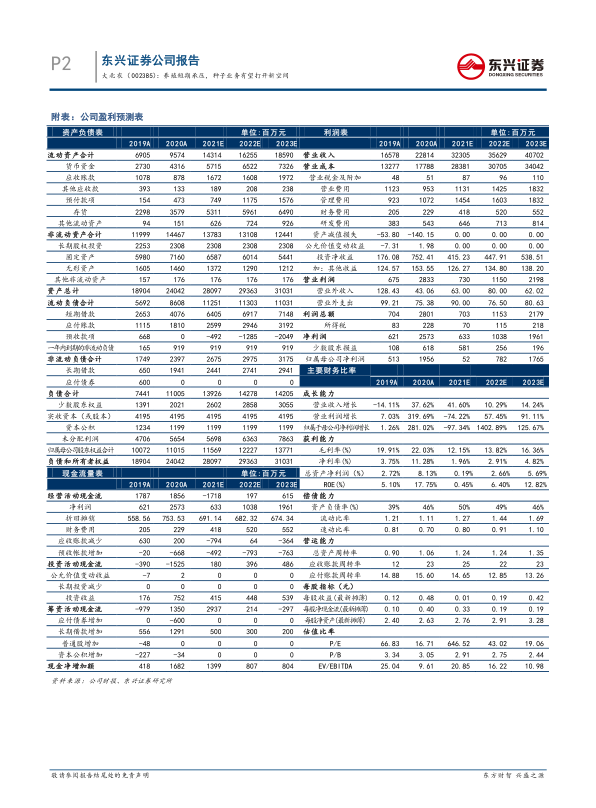 种子业务有望打开公司新的增长空间。公司将种业发展作为未来驱动公司发展的重要方向。特别是在生物育种方面,公司无论在转基因产品和技术储备方面都处于国内领先水平, 目前正与 40 多家重要种企合作开展转基因性状导入,涉及品种达 180 多个。截至目前公司已获得了三个转基因玉米和两个转基因大豆生物安全证书,转基因玉米、大豆都做到了第二代、第三代的研发。 10 月 8 日,公司公告转基因玉米产品 DBN9936 获得美国 FDA转基因产品上市前食用安全批准,表明公司转基因产品在国际上也具备较强竞争实力。近期公司加快传统种子业务整合力度,拟将 2 家种业控股子公司全部股权划转至全资子公司创种科技,进一步完善传统种业布局。我们认为,未来公司将在传统育种和生物育种方面共同发力,有望在种业政策利好与转基因商用化落地加速背景下首先受益,打开公司新的增长空间。