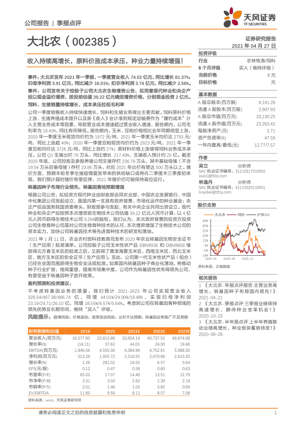 事件:大北农发布 2021 年一季报,一季度营业收入 74.02 亿元,同比增长 81.37%;归母净利润 3.91 亿元,同比减少 16.01%;扣非净利润 3.74 亿元,同比减少 2.56%。事件:公司发布关于控股子公司大北农生物增资公告,拟同意现代种业和央企产投以现金溢价增资,按投前估值 39.22 亿元确定增资价格,分别现金投资 2 亿元。饲料、生猪销量持续增长,成本承压拉低毛利率