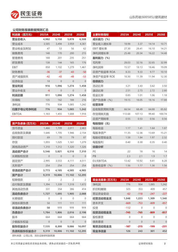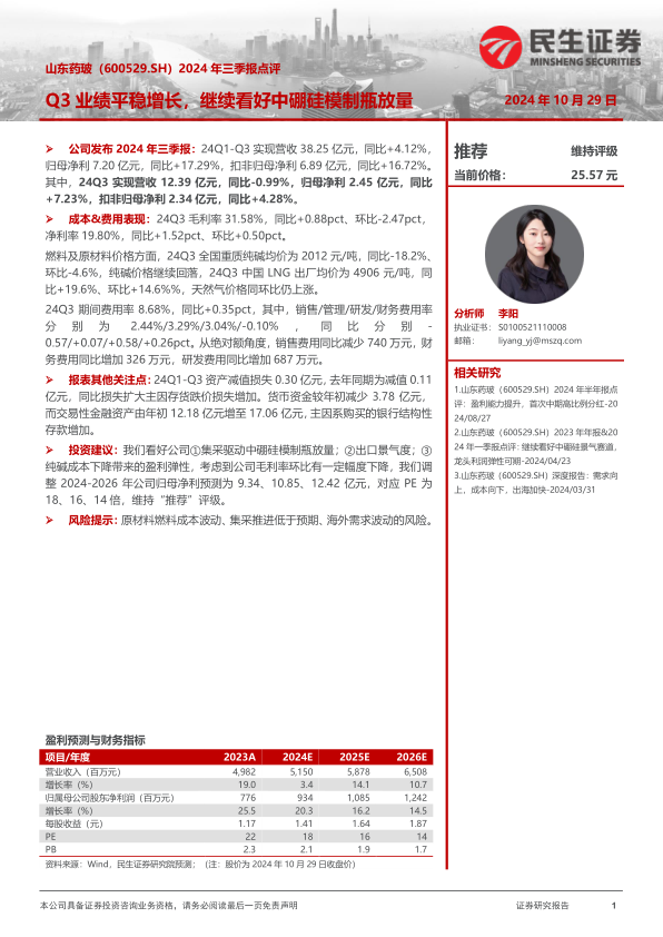 投资建议:我们看好公司①集采驱动中硼硅模制瓶放量;②出口景气度;③纯碱成本下降带来的盈利弹性,考虑到公司毛利率环比有一定幅度下降,我们调整2024-2026年公司归母净利预测为9.34、10.85、12.42亿元,对应PE为18、16、14倍,维持“推荐”评级。
