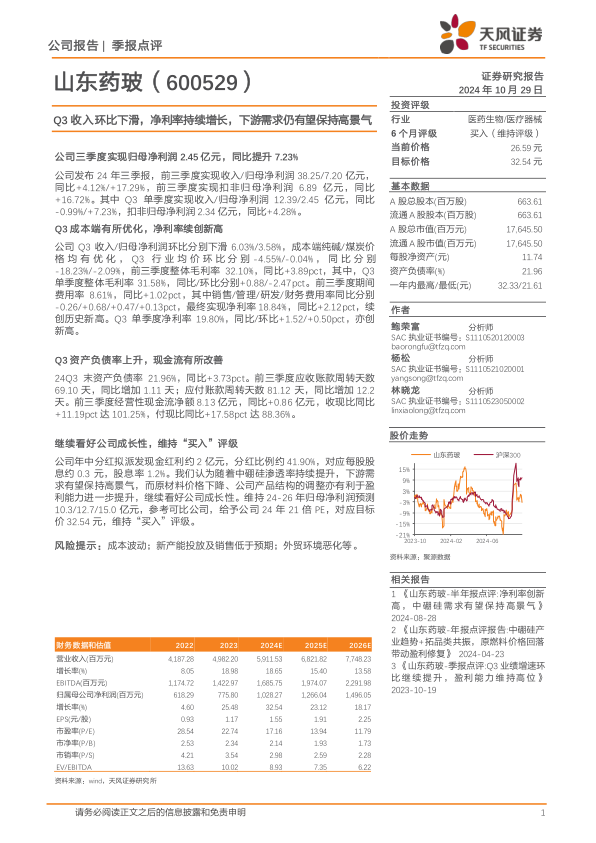 报告维持对山东药玻“买入”评级,目标价为32.54元,理由是公司产品结构调整和原材料价格下降有利于盈利能力进一步提升。